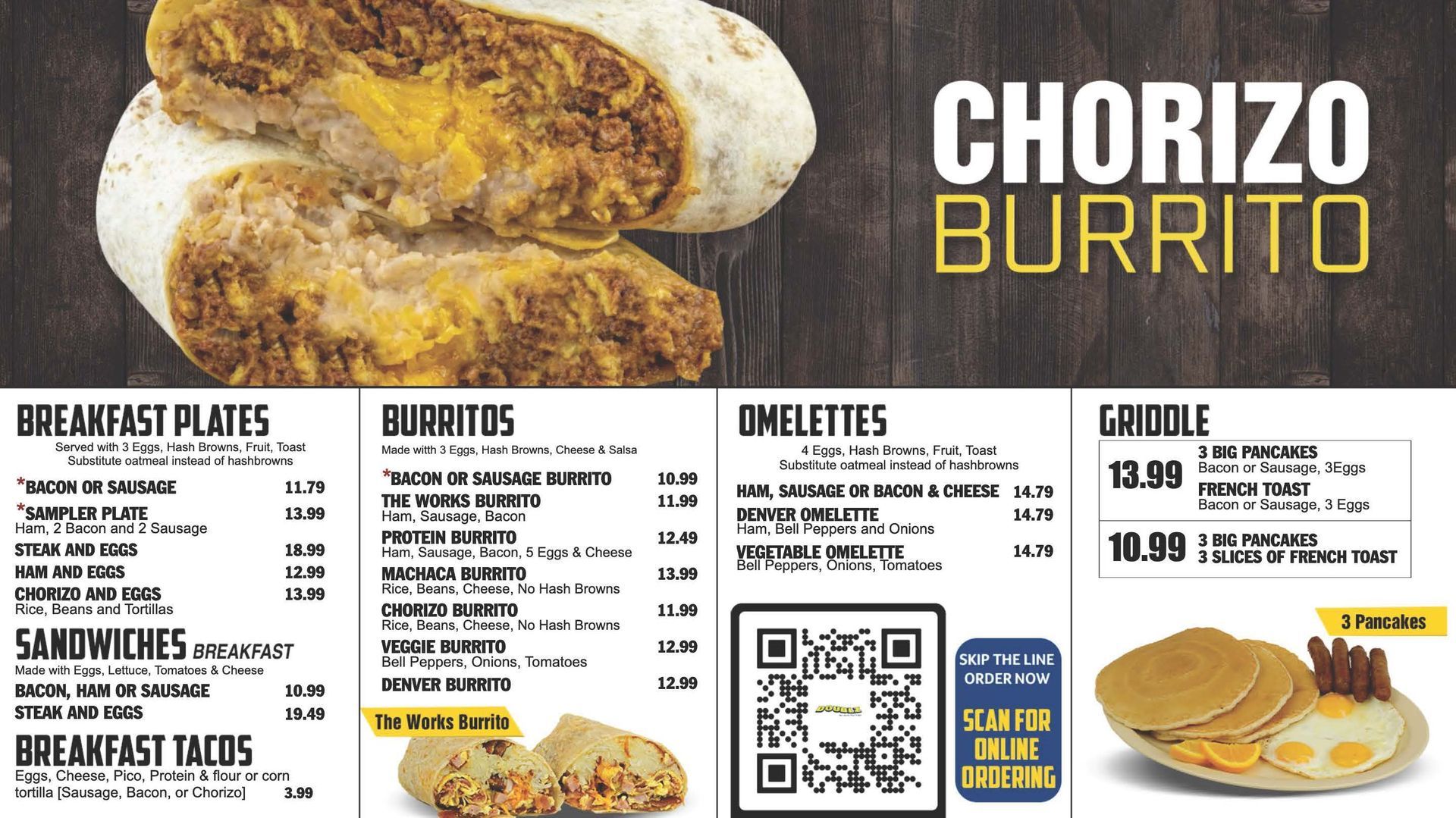 Includes 3 Big Pancakes, eggs and bacon or sausage.